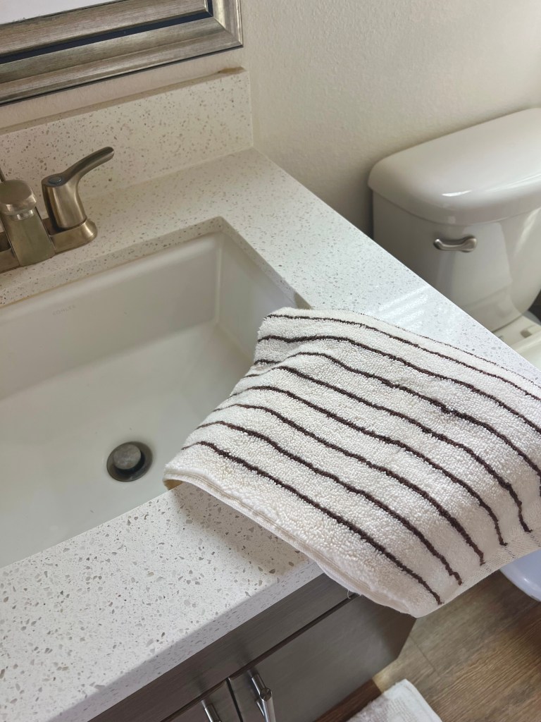 Then I found the striped hand towel at TJ Maxx. I had actually been eyeing similar ones on Amazon for a while, so when I saw these in person I had to grab them. They’re also 100% cotton and feel so thick and soft—such good quality.