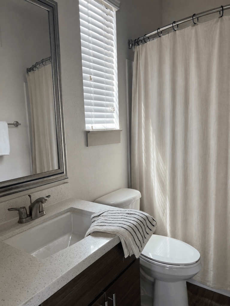 My first stop was Target. I found the Casa Luna linen shower curtain and their 100% cotton towels, and I instantly loved how simple and elevated everything felt. They also had these really pretty black shower curtain rings, and I loved the contrast against the beige linen. It gives it a slightly edgy, almost moody look, while still feeling clean, minimal, and calm.